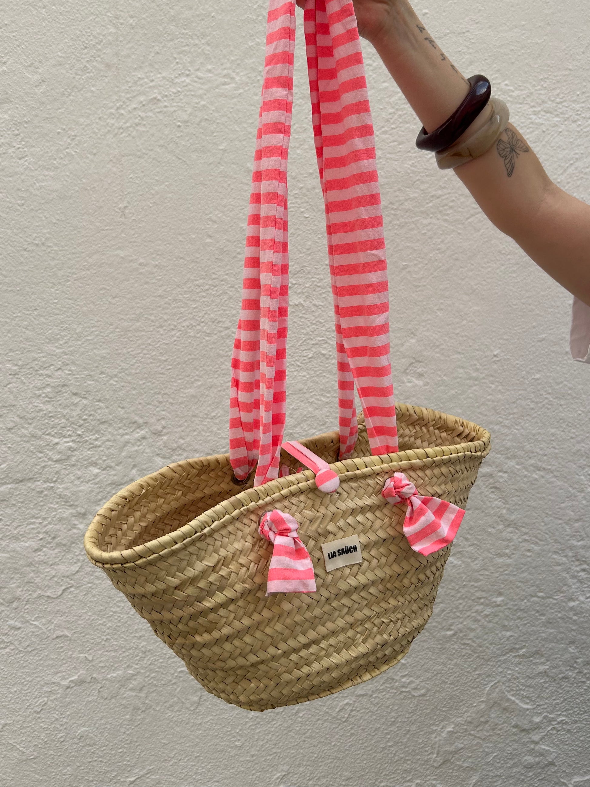 Auténtico y lleno de encanto: este capazo está tejido a mano con palma natural, lo que le aporta resistencia y un acabado único en cada pieza. Sus asas están confeccionadas en tela oxford, un detalle textil que combina textura y frescura, aportando un toque original y elegante.