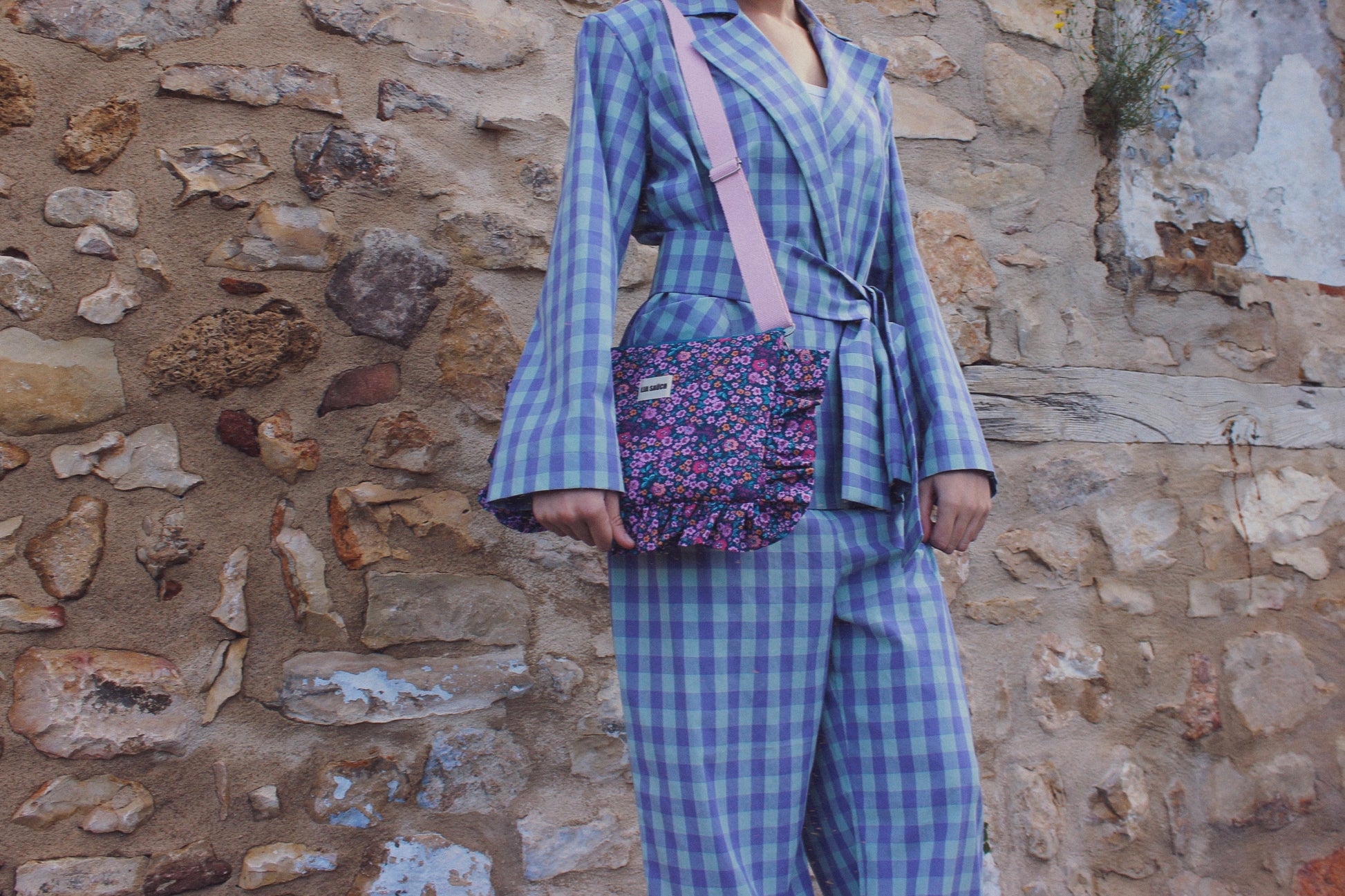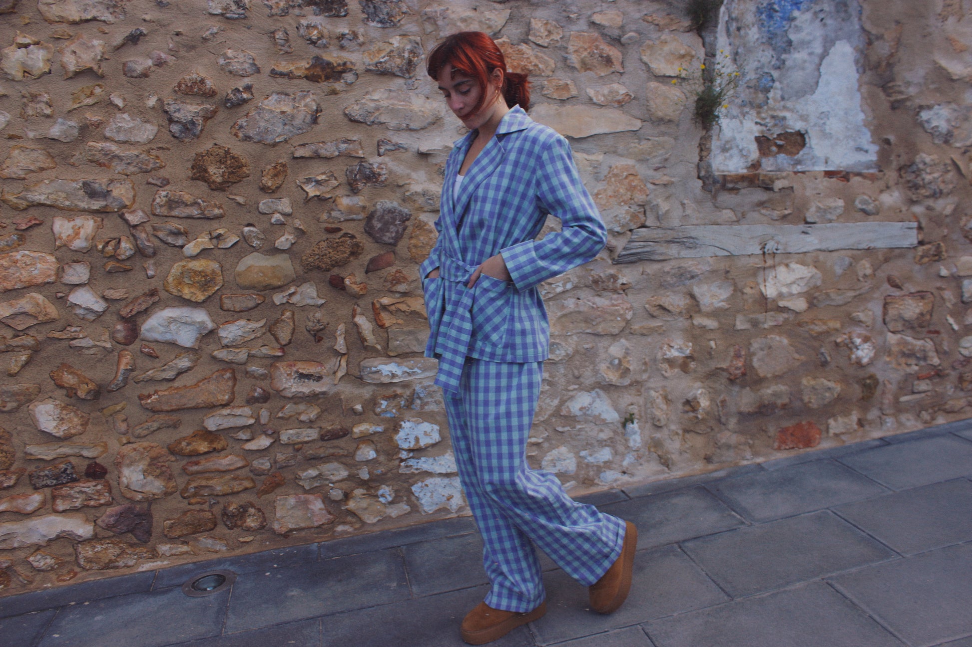 Un traje que redefine el minimalismo con su estampado vichy lavanda y menta. El pantalón, con cintura elástica = comodidad sin renunciar al estilo.